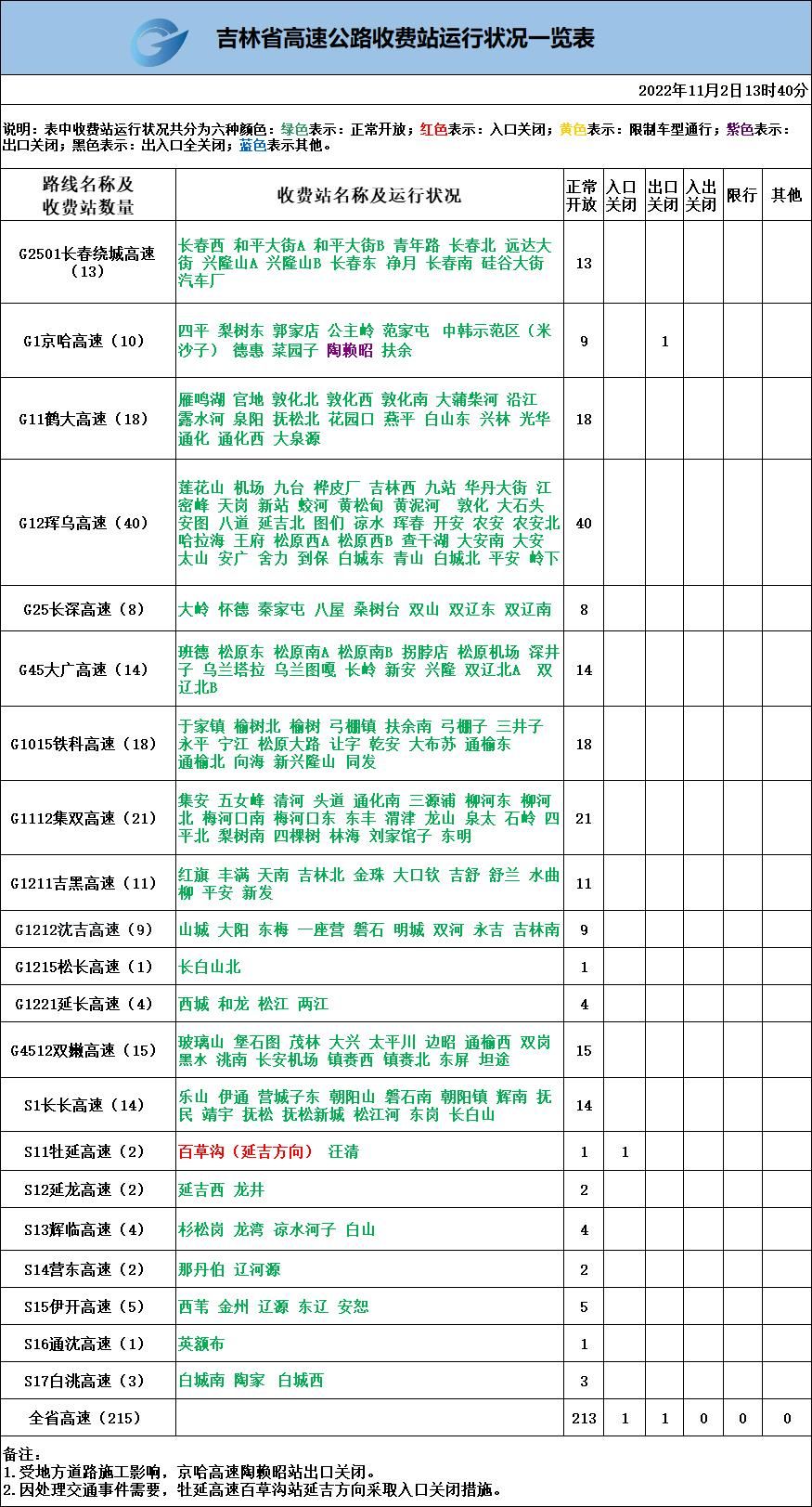 吉林省高速公路收費站運行狀態一覽表2022年11月2日